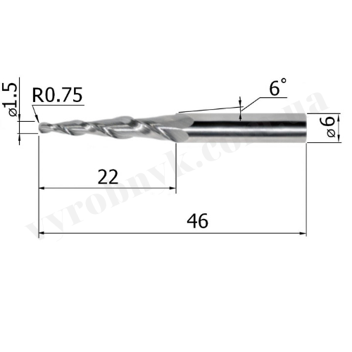 Фреза спіральна двозуба конусна сферична D6 d1.5 L46 l22 R0.75 A6 (G2246156)