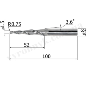 Фреза спіральна двозуба конусна сферична D8 d1.5 L100 l52 R0.75 A3.6 (G52100158)